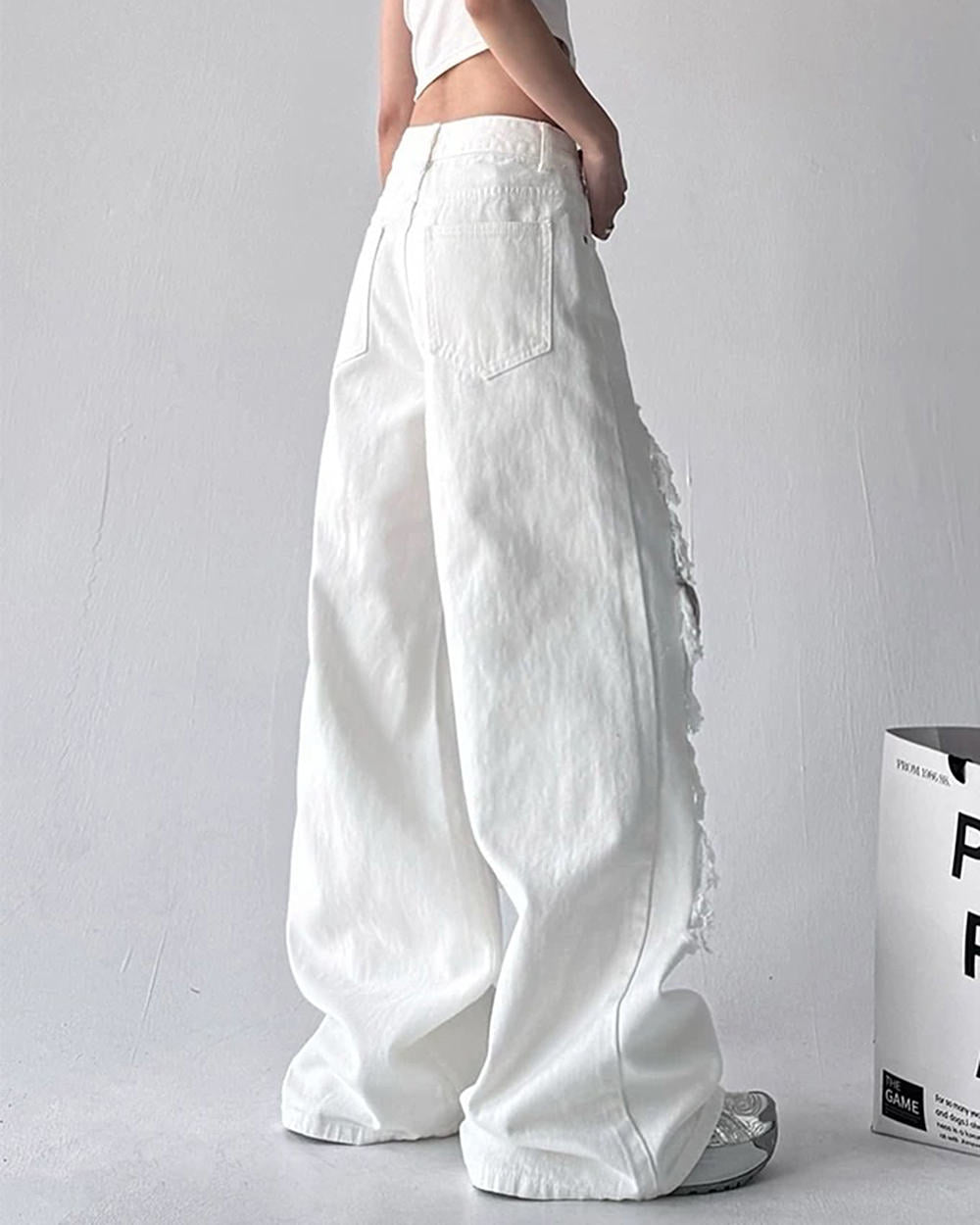 These high-waisted white jeans feature wide-leg design, distressed rips, elegantly adorned with lace detailing